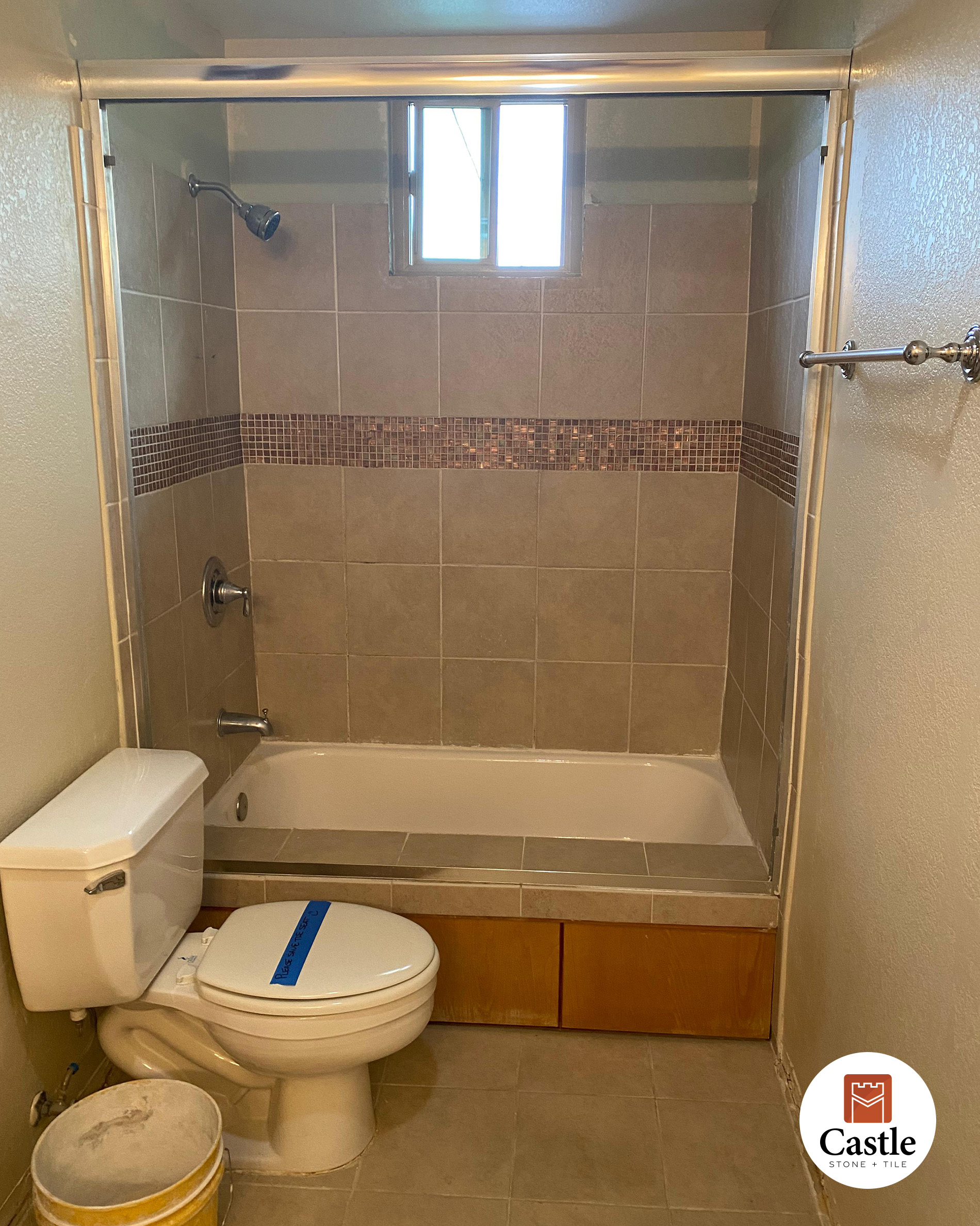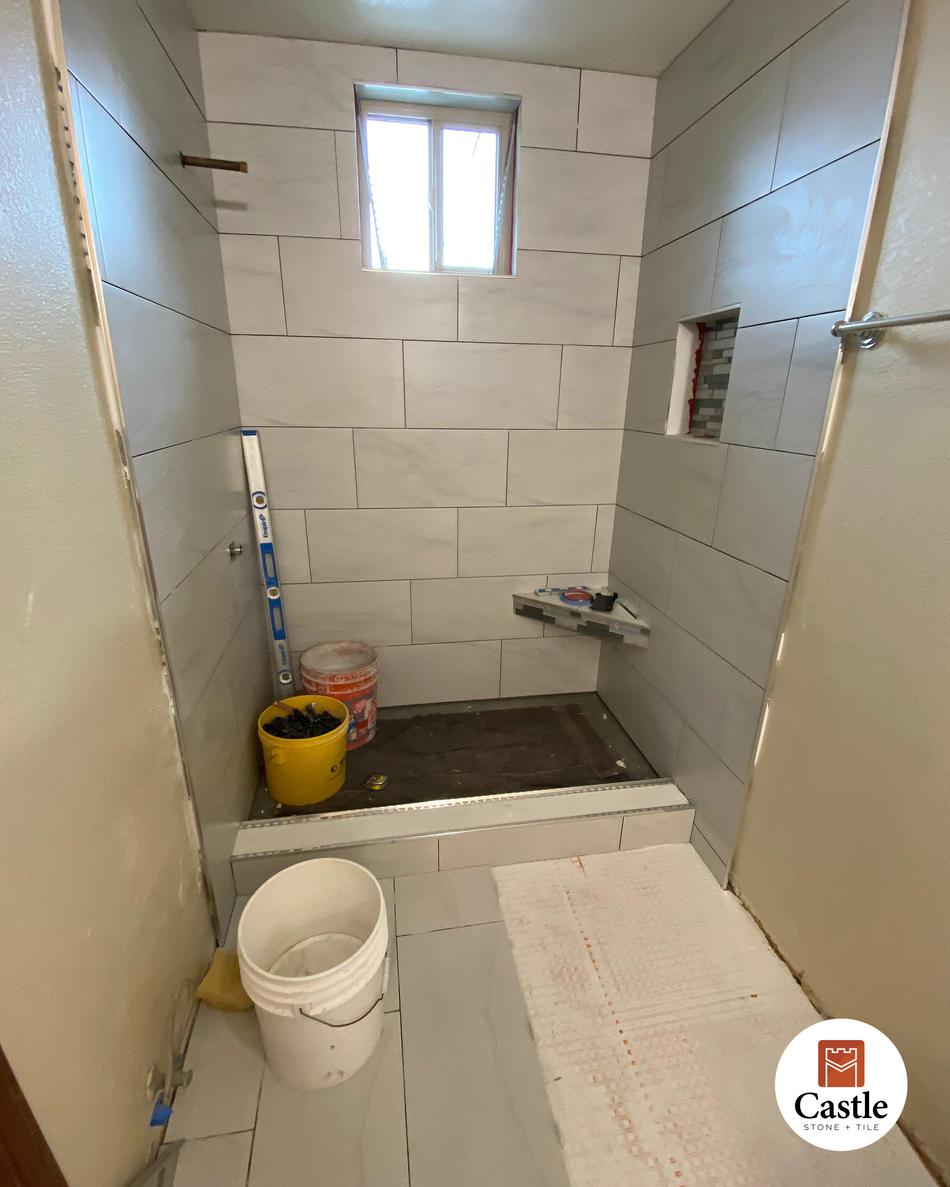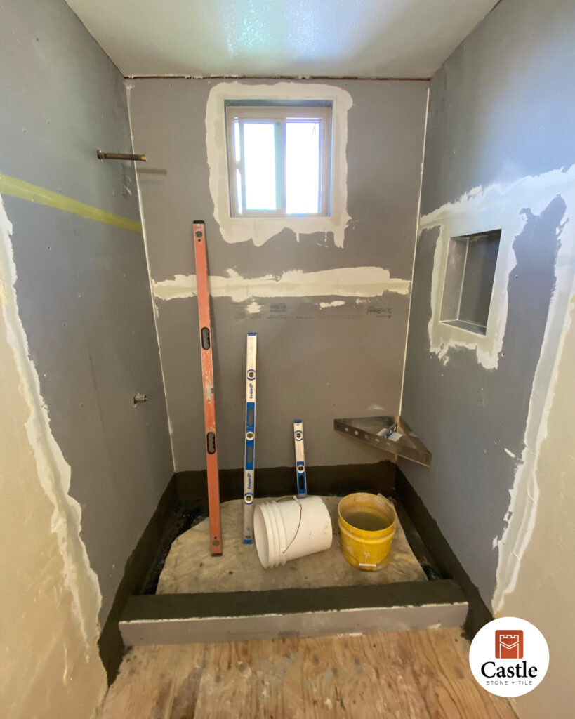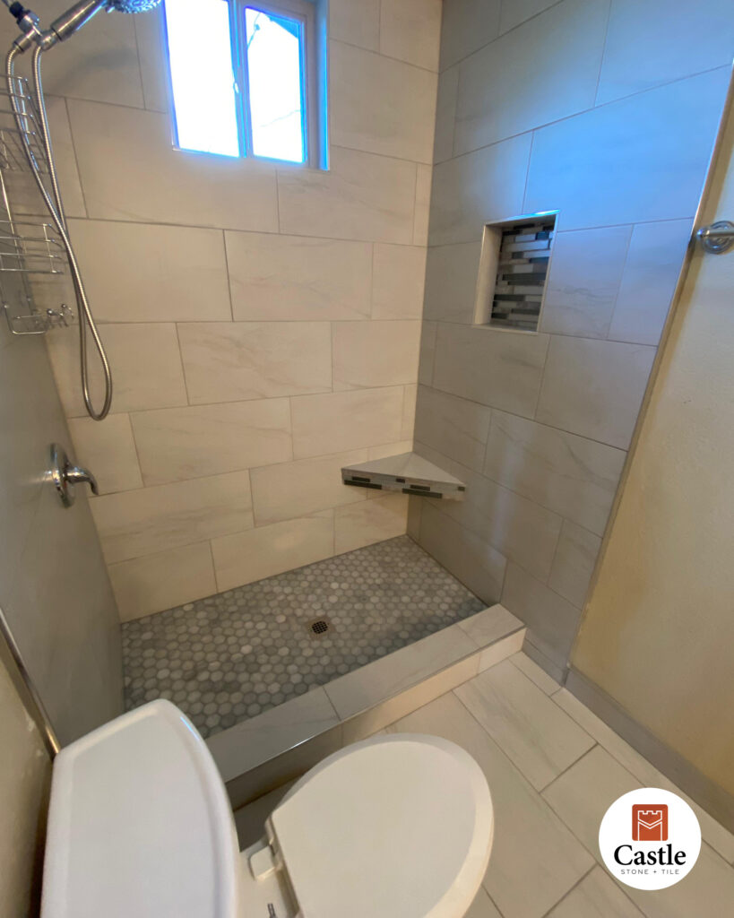 Castle Stone & Tile completed a sleek and modern bathroom remodel in Lakeside, CA, using 12×24 porcelain tiles paired with Schluter trim for crisp, polished edges. This installation highlights both durability and design, creating a clean, high-end look with lasting performance.