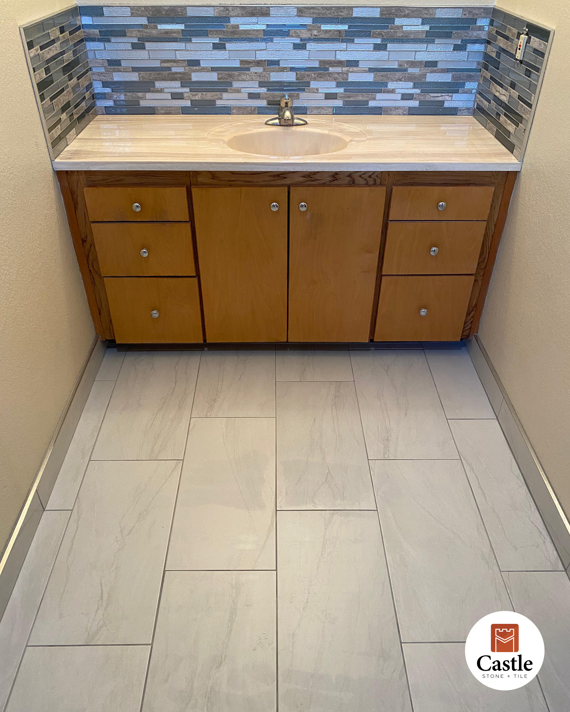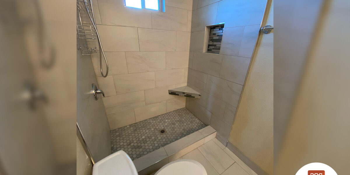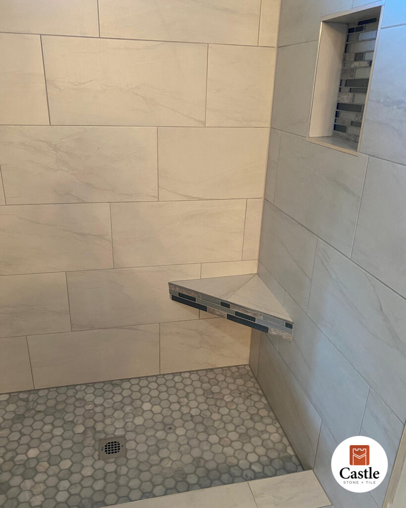 Large-Format Tile: Installed 12×24 porcelain for a spacious, seamless appearance with minimal grout lines.