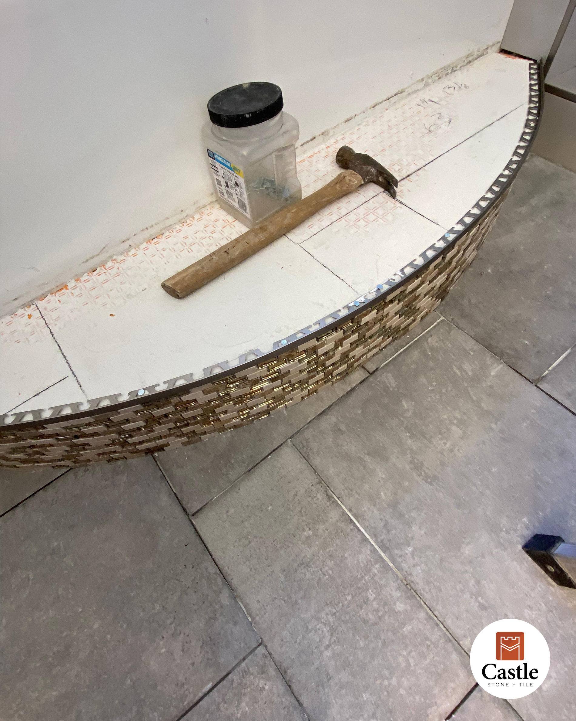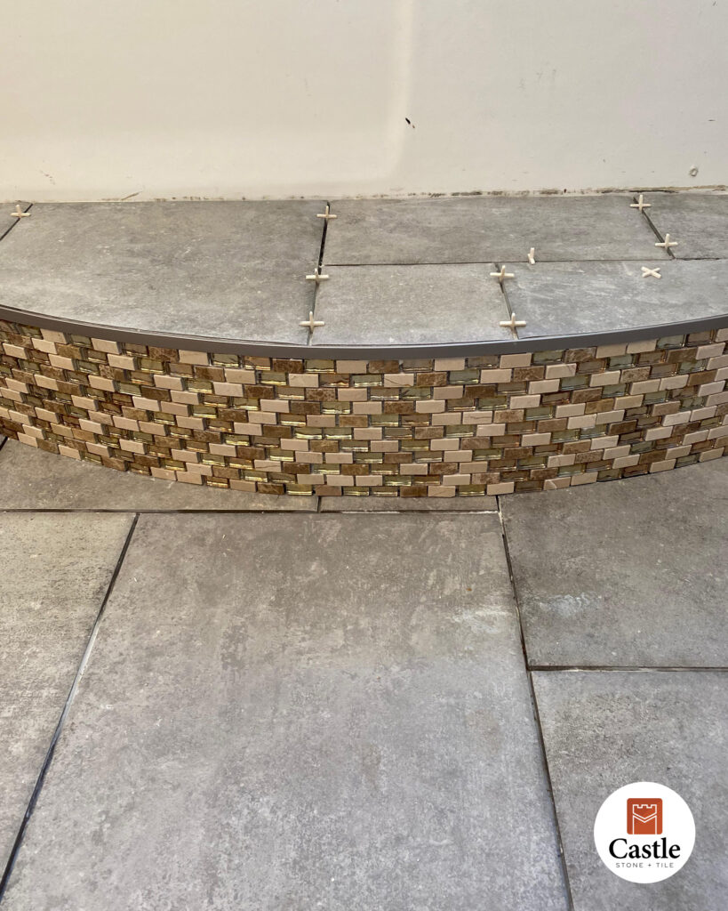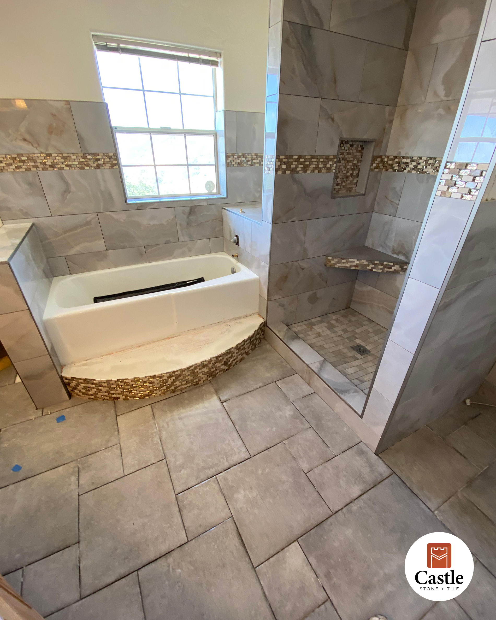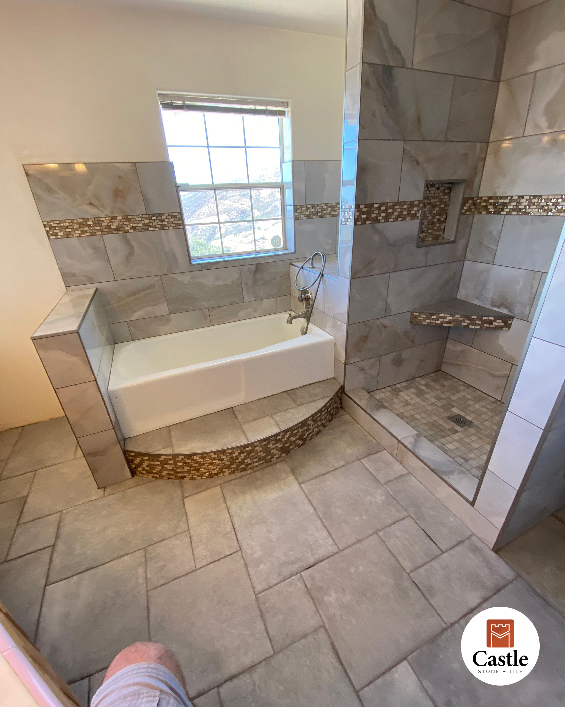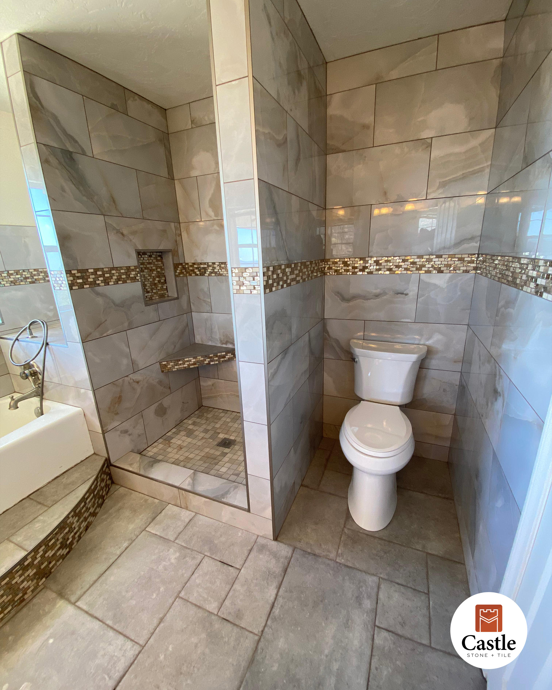 Castle Stone & Tile transformed a bathroom in Jamul, CA with a rich, earthy porcelain tile design that balances warmth and elegance. The remodel featured large-format tiles, an intricate Versailles layout on the floor, and a striking gold mosaic accent band that ties the entire space together.