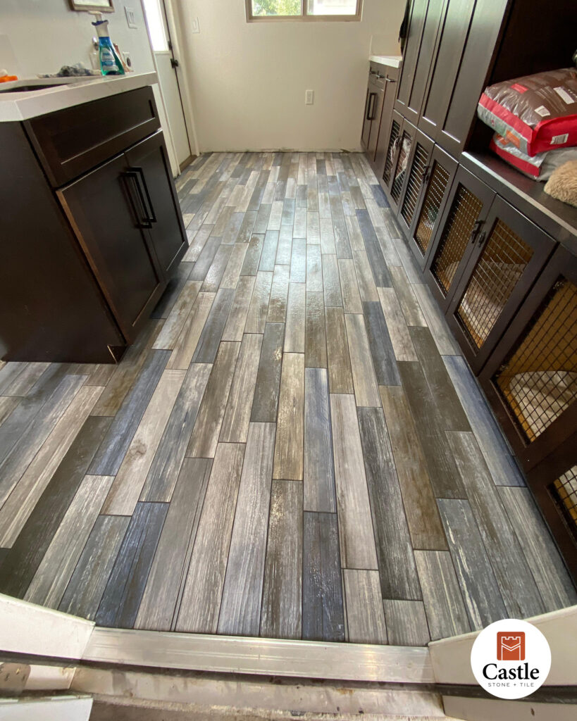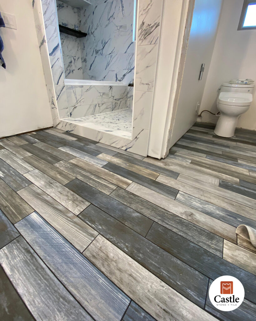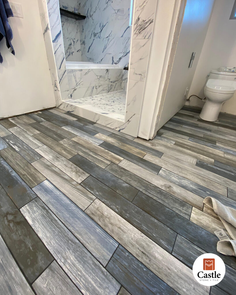 Castle Stone & Tile upgraded a bathroom and adjoining areas in Jamul, CA, with porcelain wood-look floor tiles that combine the rustic beauty of natural hardwood with the durability of tile. The multi-tone finish provides depth and texture, perfectly complementing both modern and classic interiors.