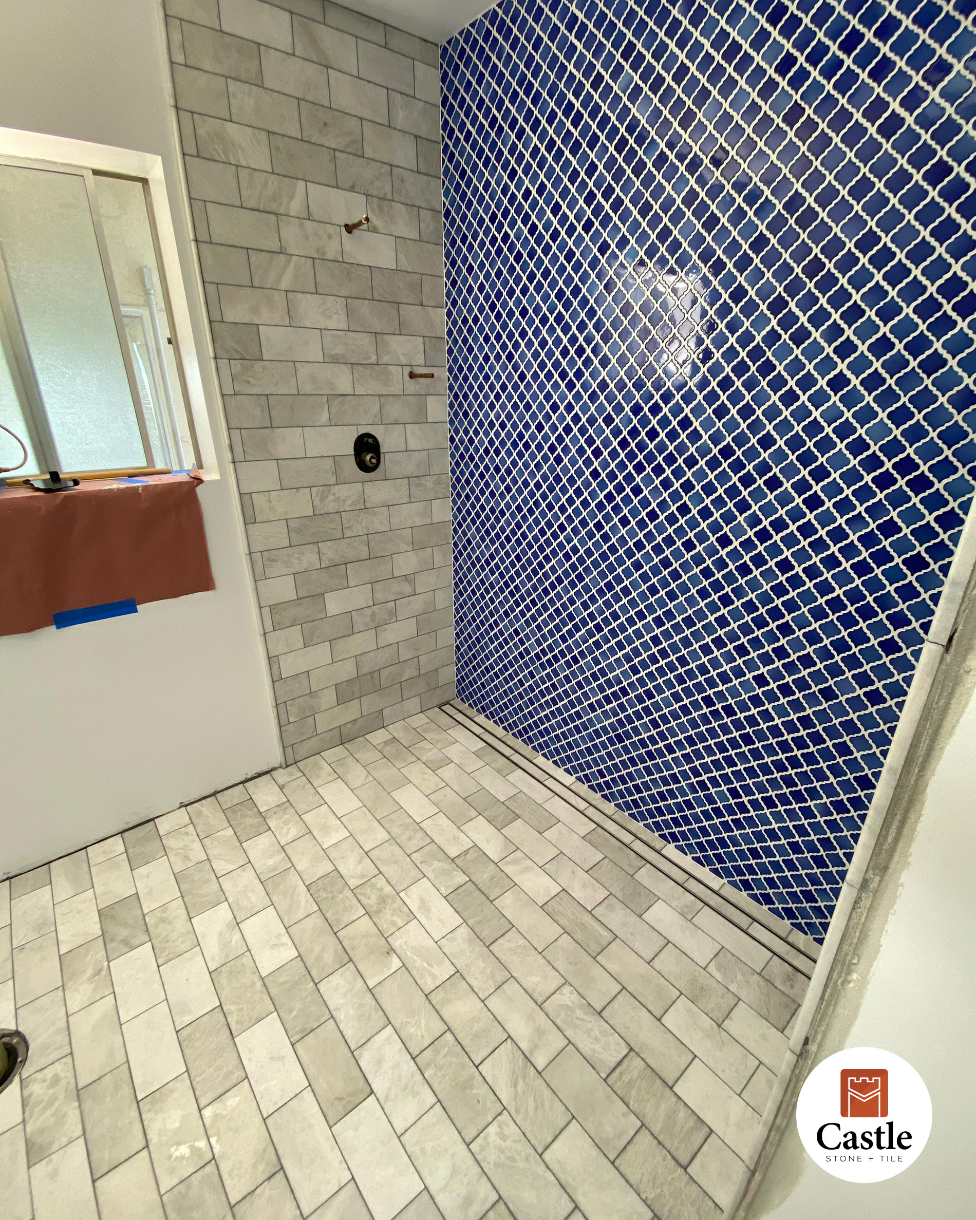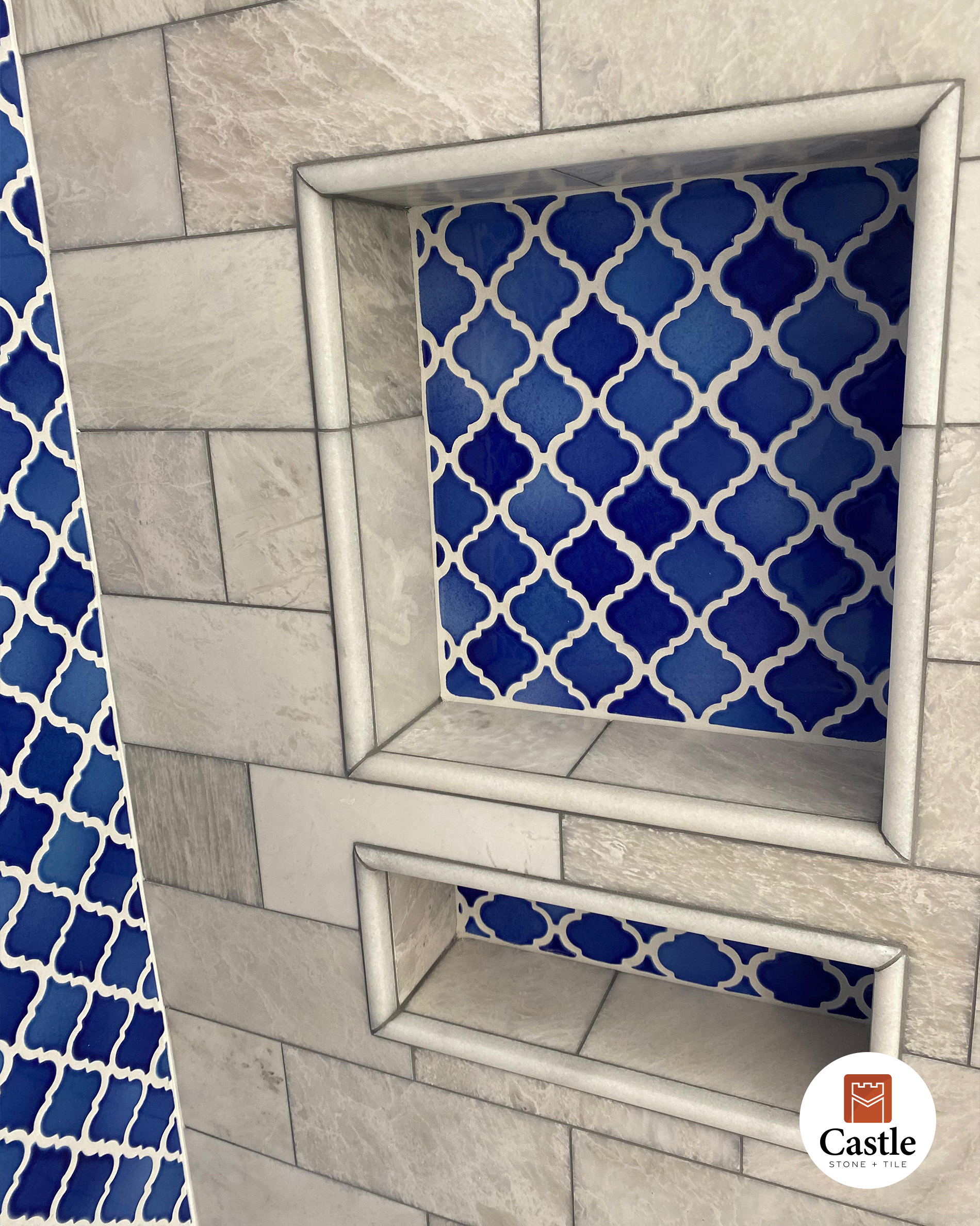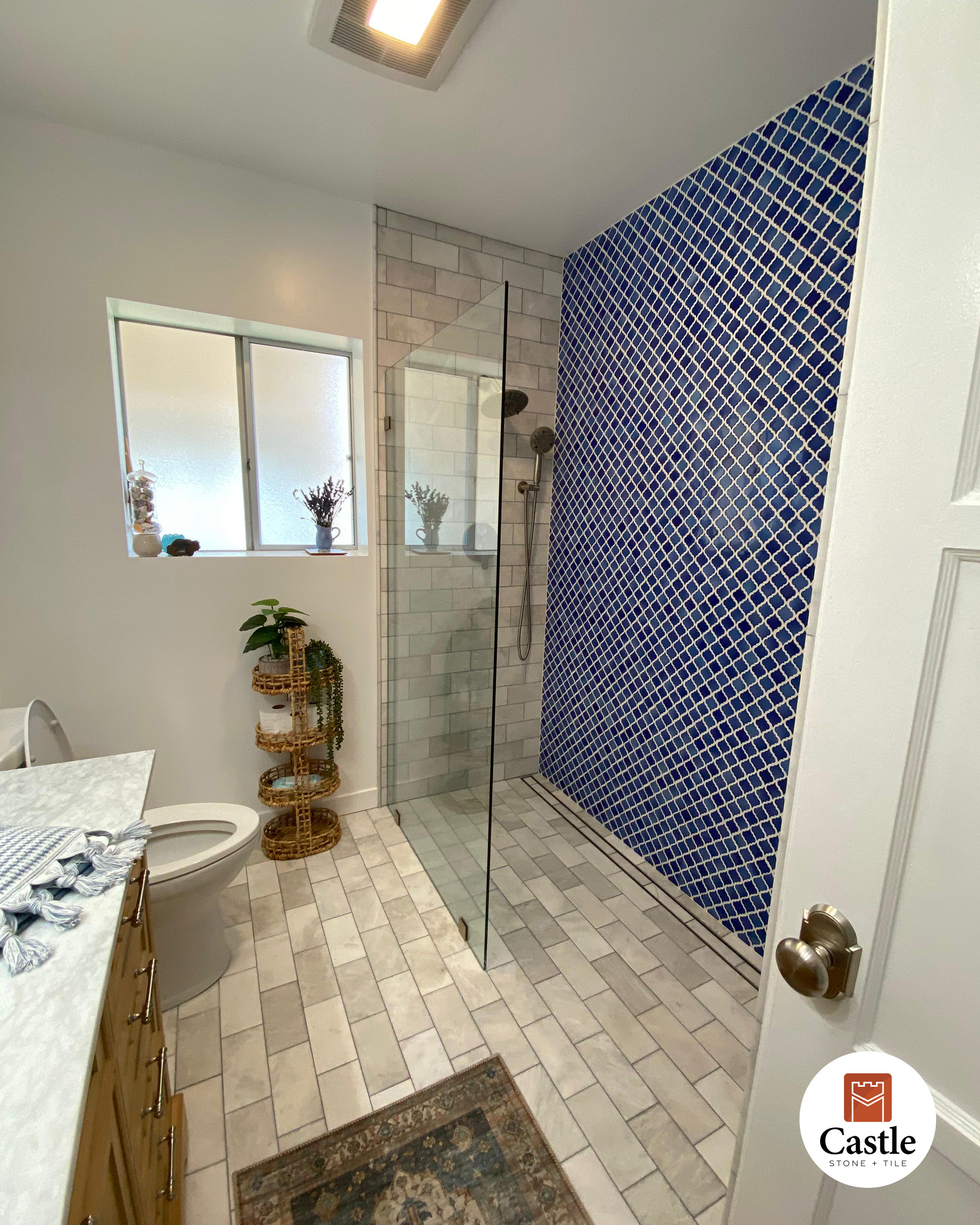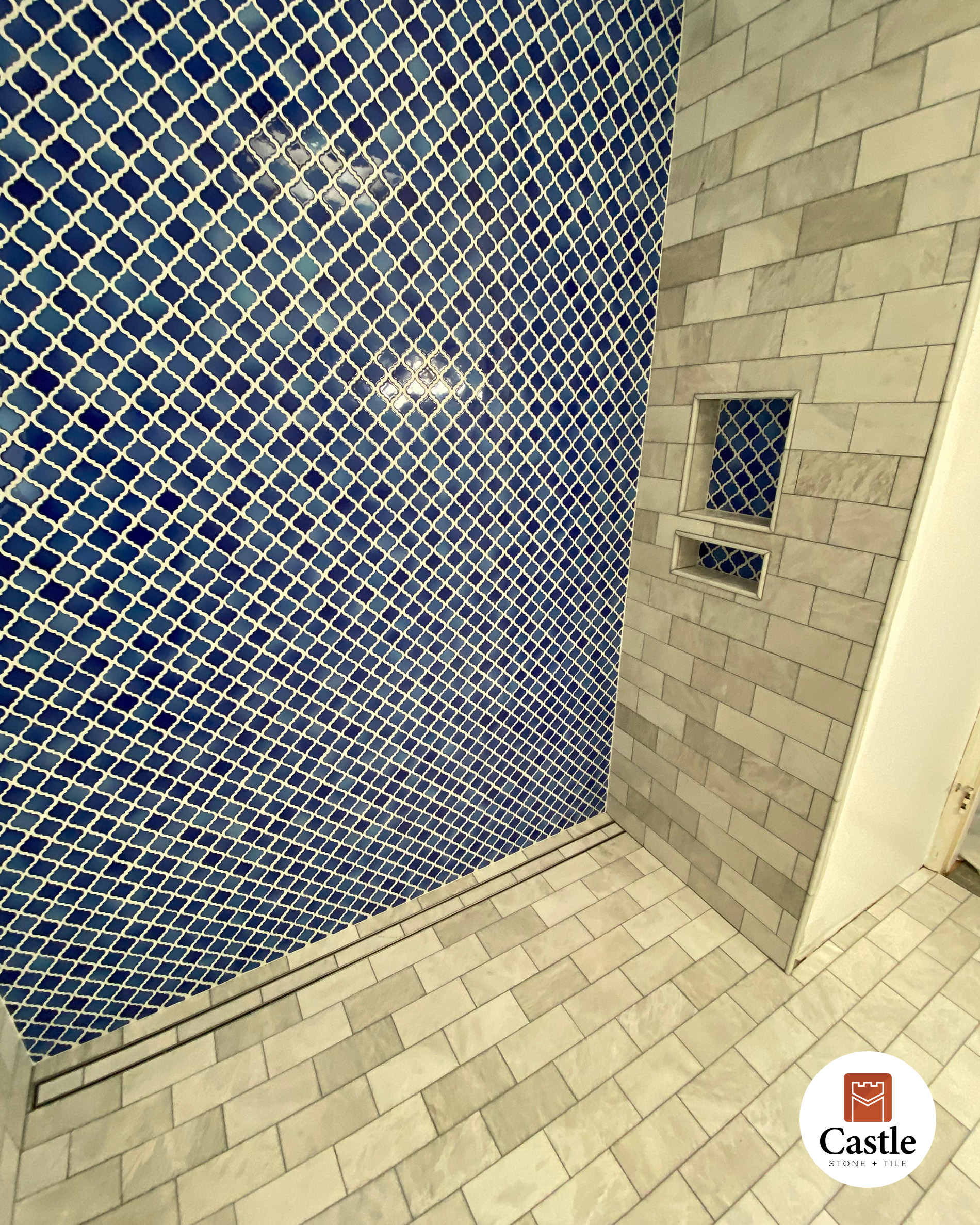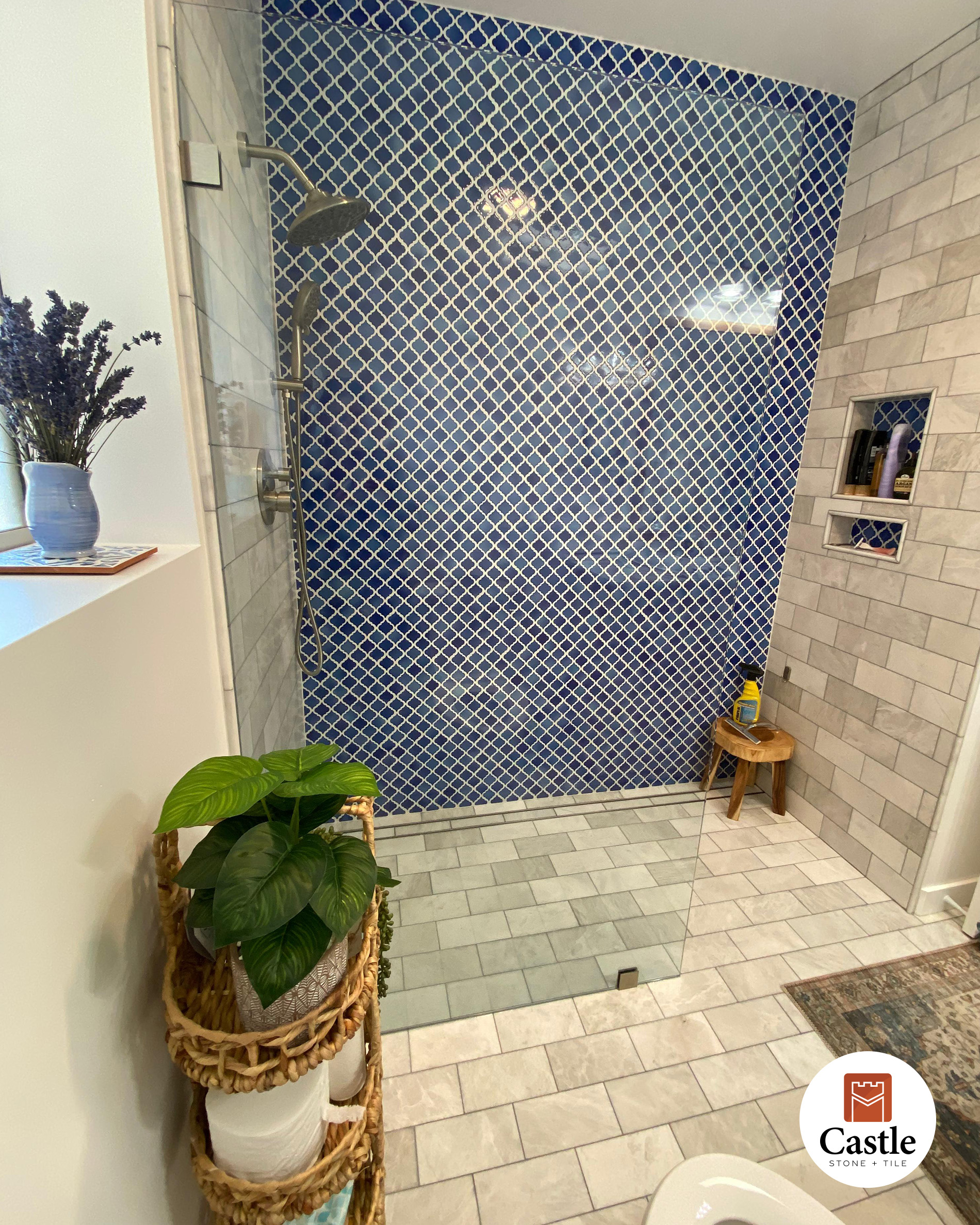 Tile Design: The striking blue Arabesque ceramic tile in the shower niche and back wall adds a bold design statement, while the 3×6 stone tile provides timeless texture and durability across the floor and walls.