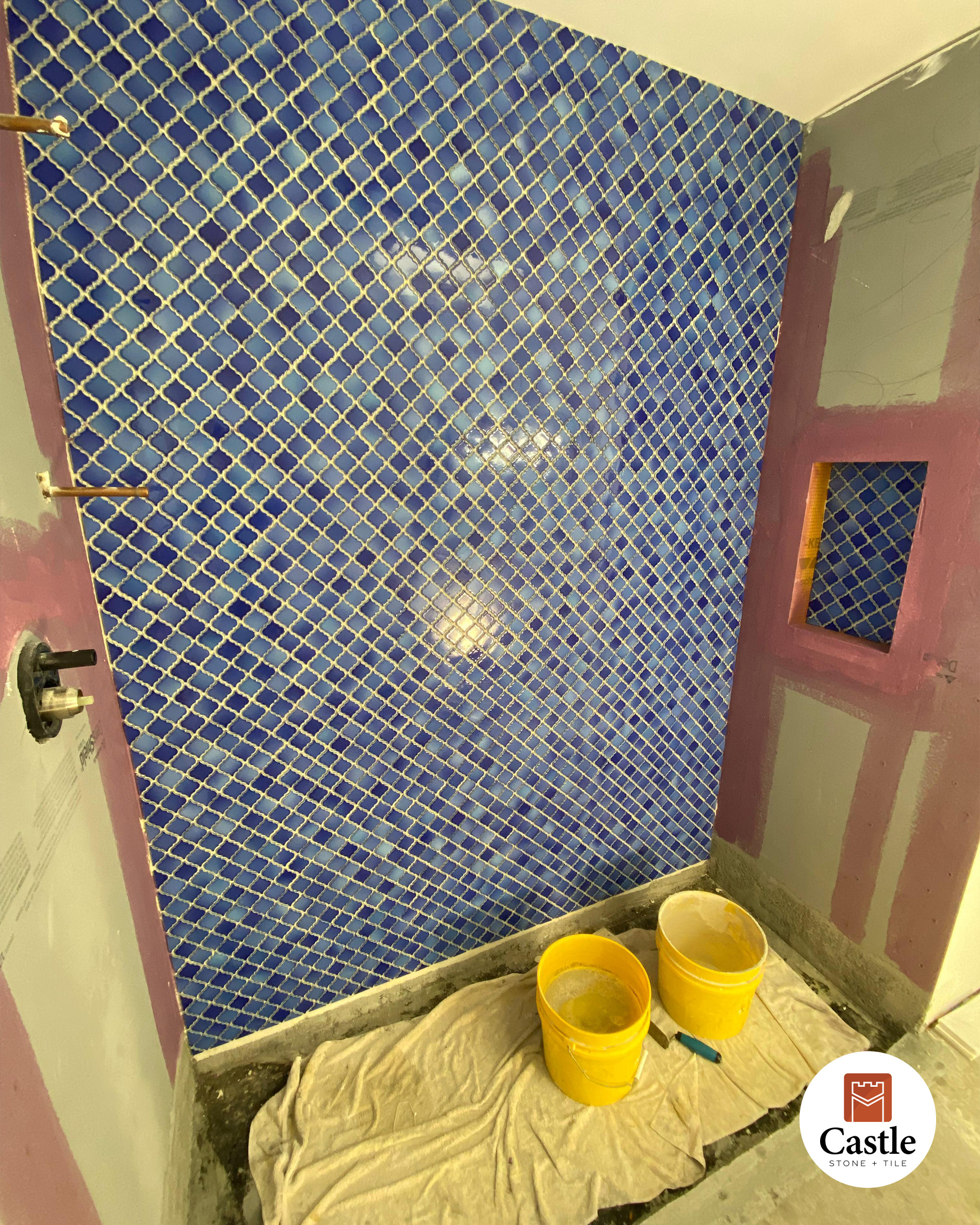Shower Back Wall & Niche: Blue Arabesque ceramic tile
