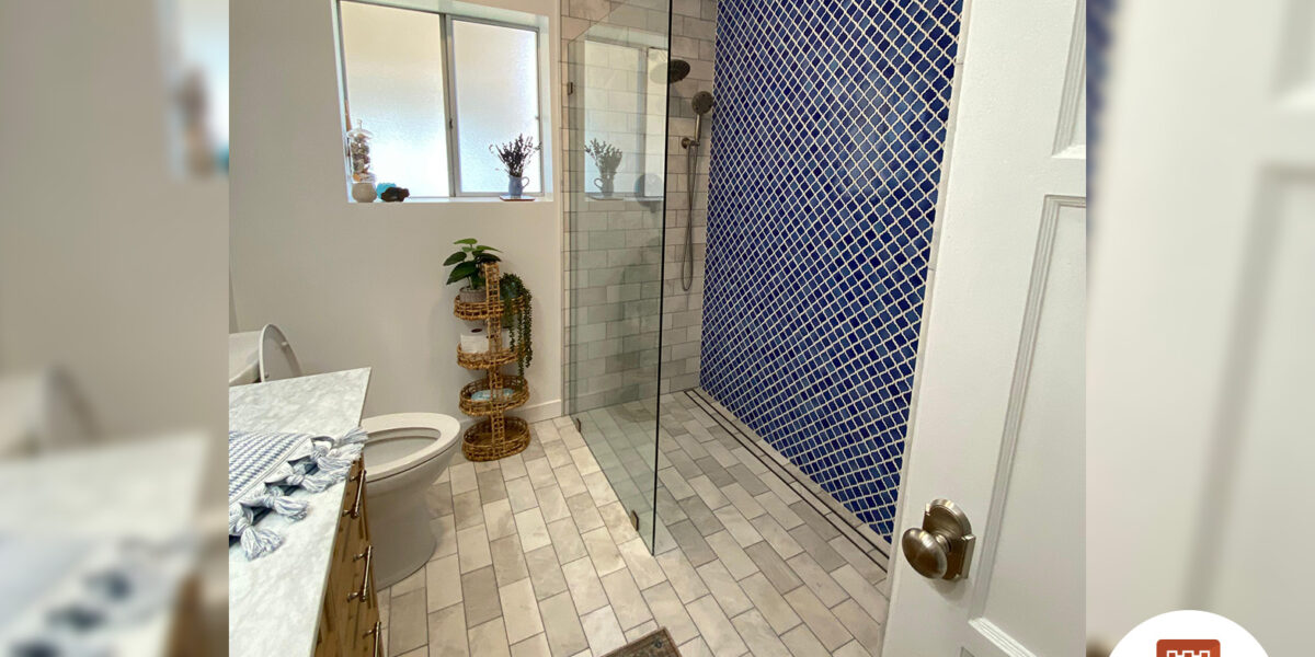 - Highlights: Structural repair, curbless walk-in shower, modern design with bold tile accents
